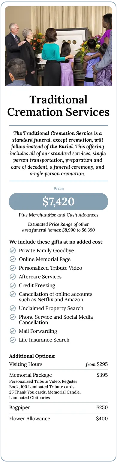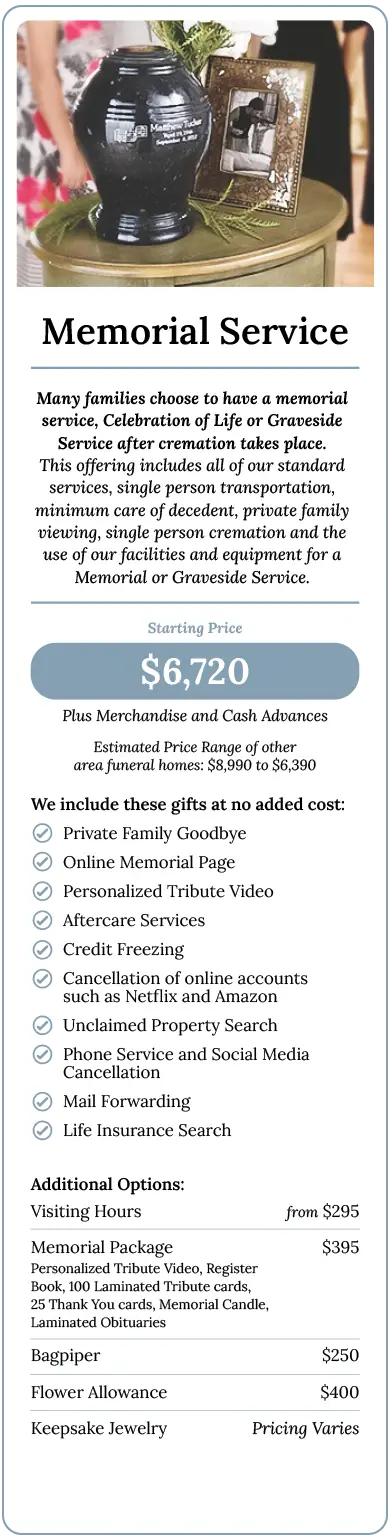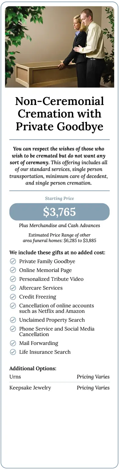 If our existing offerings do not fit your needs, we encourage you to speak openly with our Funeral Directors. We will tailor a service to accommodate your preferences and budget. Our knowledgeable staff can make suggestions to keep your costs low while adhering to our strict standards of integrity and respect.