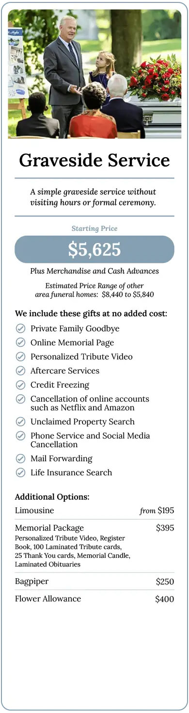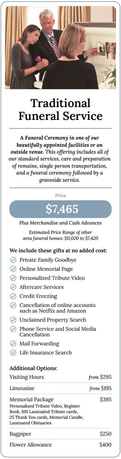 Regardless of which funeral home you select, there will be outside charges. These expenses should be the same at any funeral home. Examples of these outside costs may include Cemetery Expenses, Newspaper Notices, Church or Clergy Honorariums.